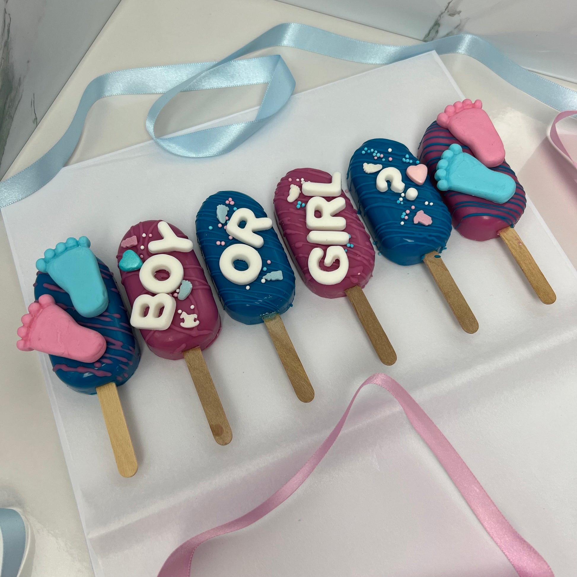 De Gender Reveal cakesicles zijn perfect om het geslacht van jullie baby te onthullen. Het geslacht wordt bekend gemaakt wanneer je een hap neemt van de cakesicle. Zo onthul je de heerlijk smeuïge roze of blauwe cake dough.