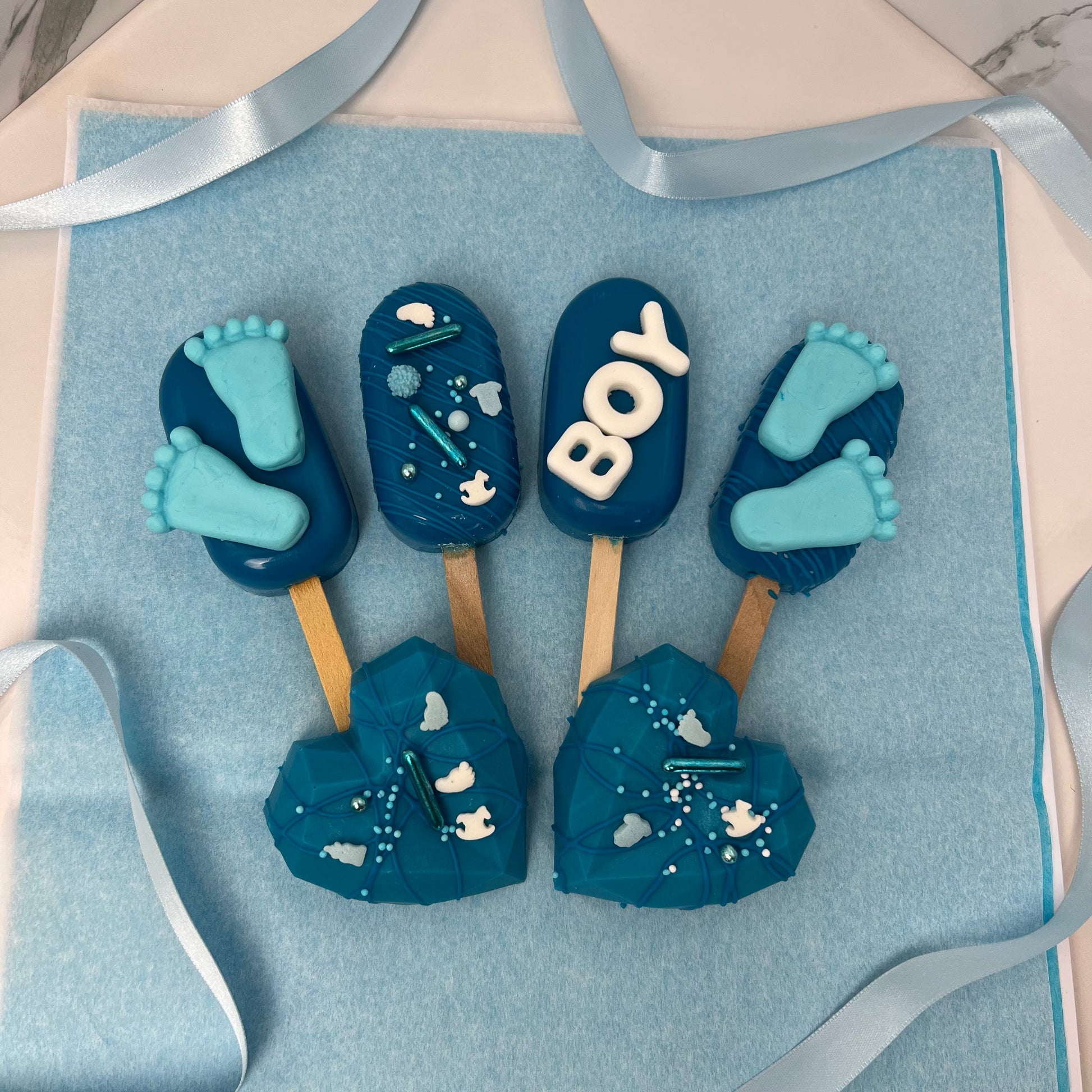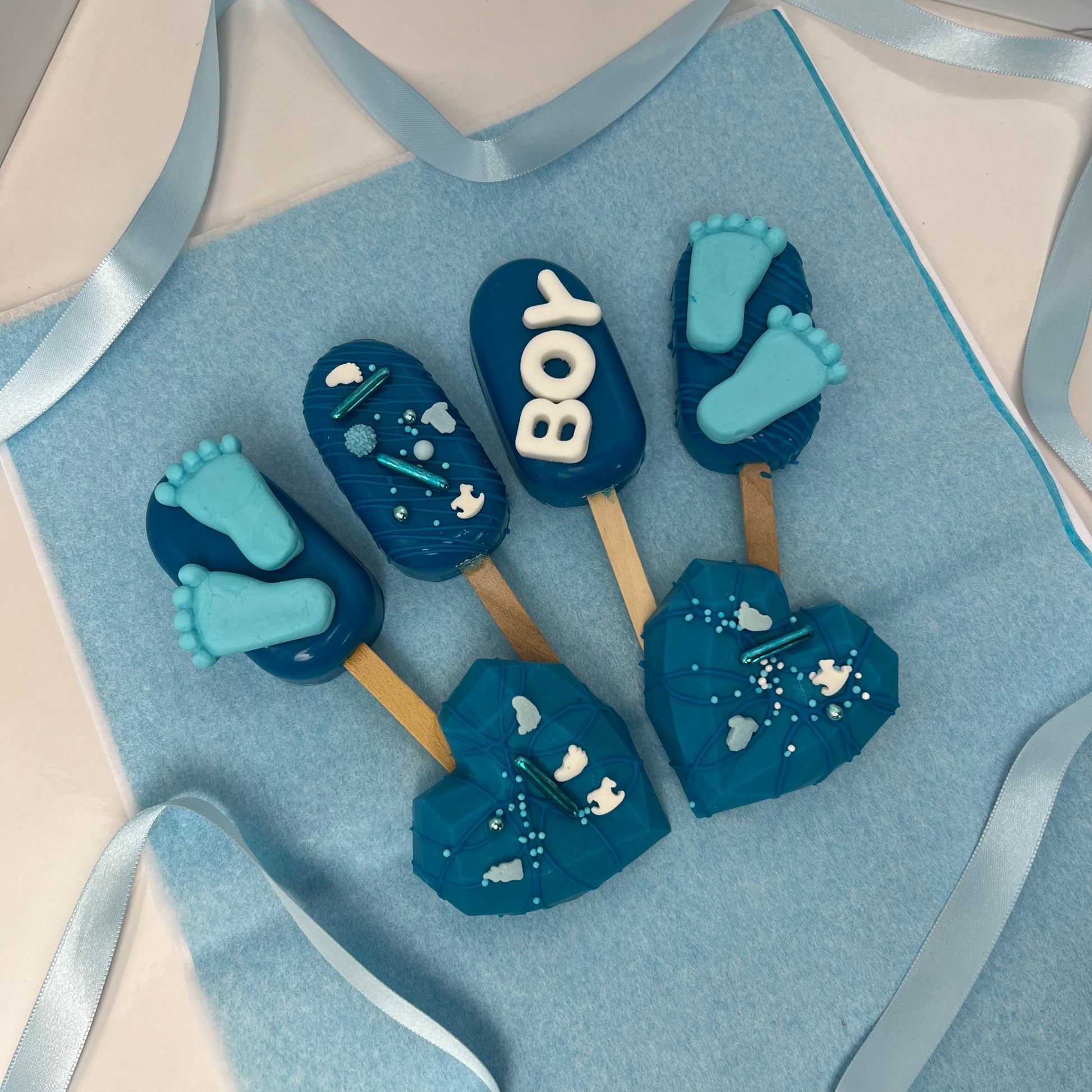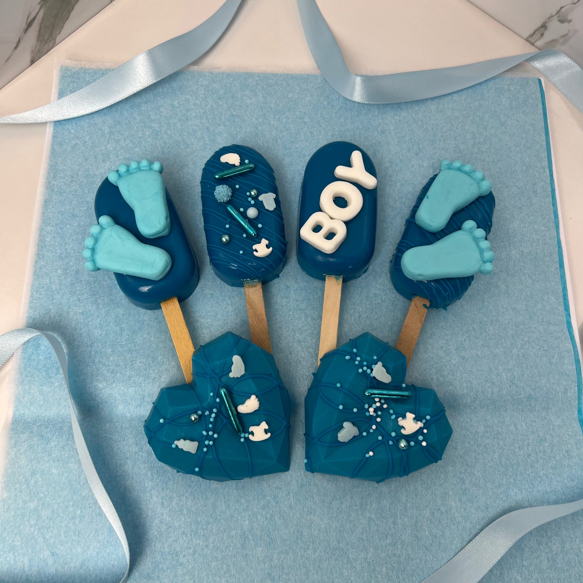 De It's A Boy cakesicles zijn perfect voor een babyshower.