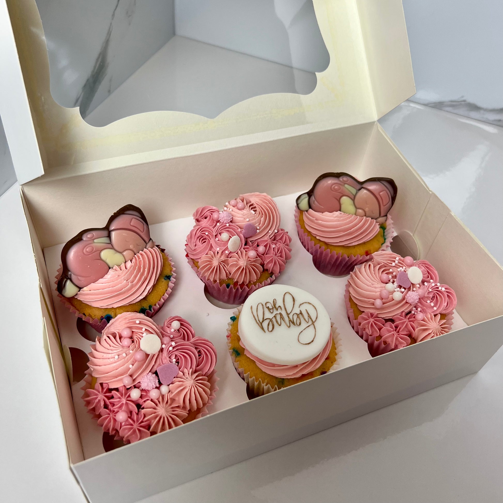 De It's A Girl Cupcakes zijn perfect voor een babyshower. De cupcakes worden afgewerkt met roze en witte sprinkles, twee 'roze' baby chocolaatjes en een mooie fondant topper.