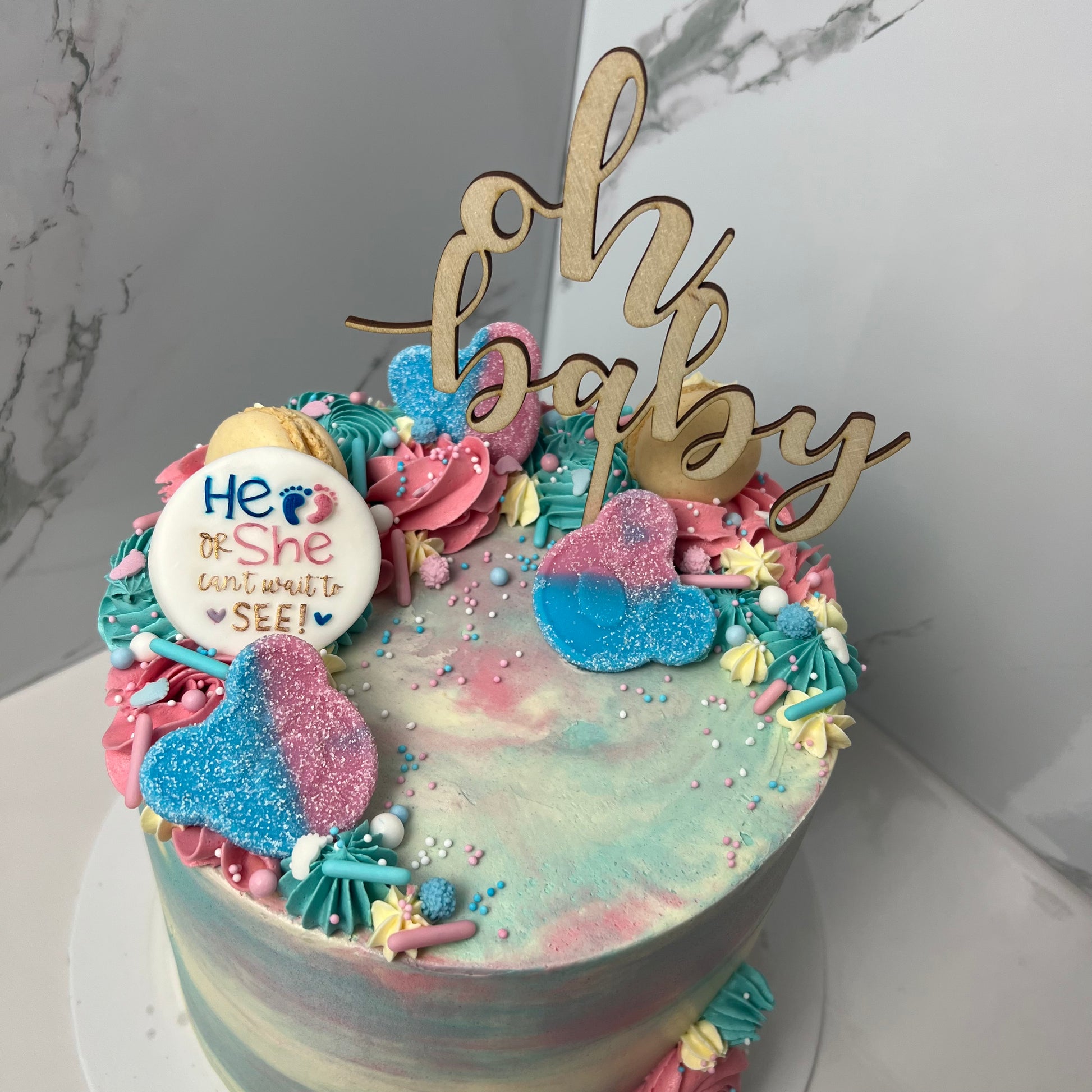 De gender reveal taart is voor ongeveer 12-16 personen en bestaat uit vier lagen luchtige biscuit. De taart wordt gedecoreerd en afgewerkt met een heerlijke blauw-, roze- en witkleurige botercrème, sprinkles, zure teddybeer snoepjes, macarons, een fondant topper en een houten topper.