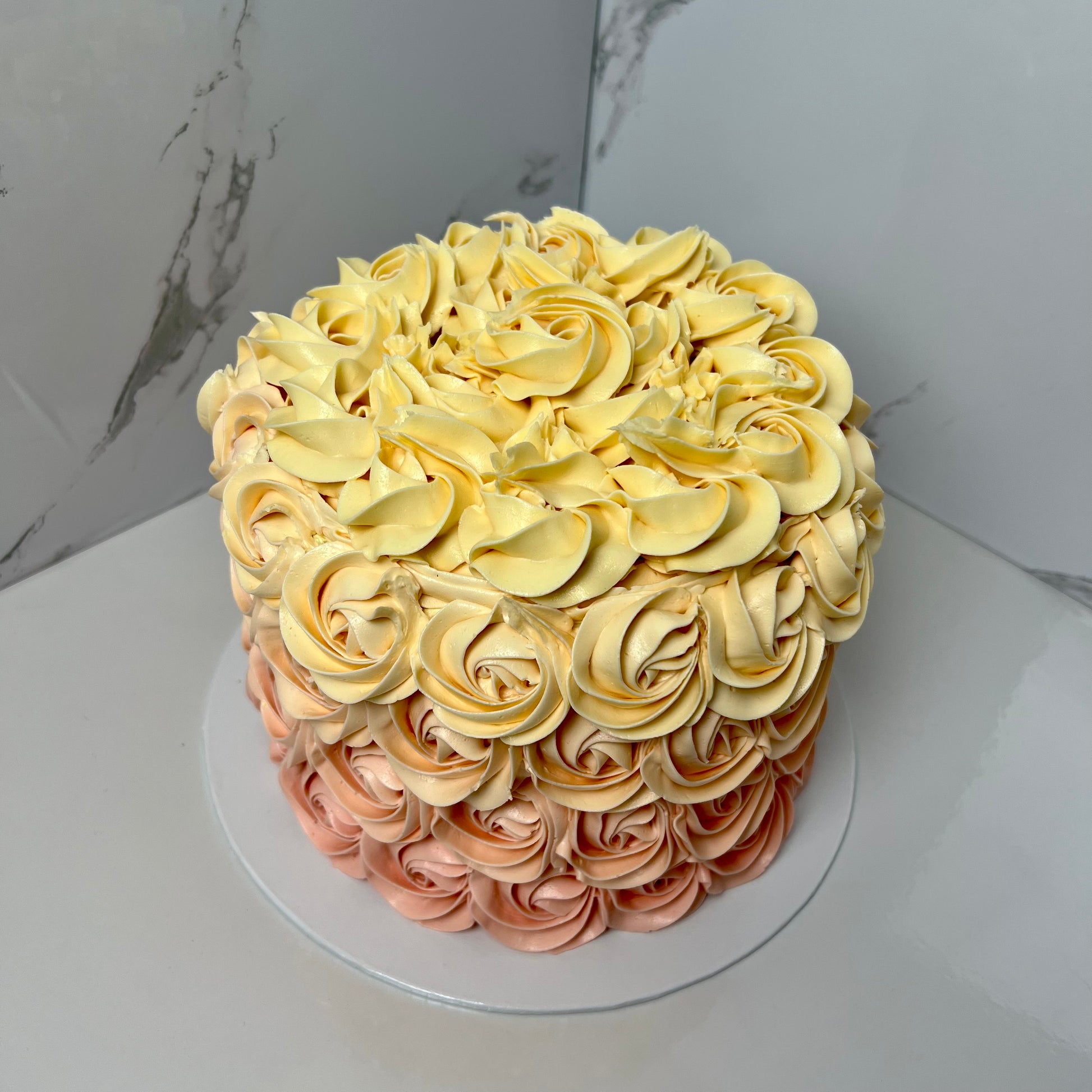 De rosette taart is voor ongeveer 12-16 personen en bestaat uit vier lagen luchtige biscuit. De taart wordt gedecoreerd en afgewerkt met een heerlijke botercrème in rosettevorm en eventueel een gepersonaliseerde topper.