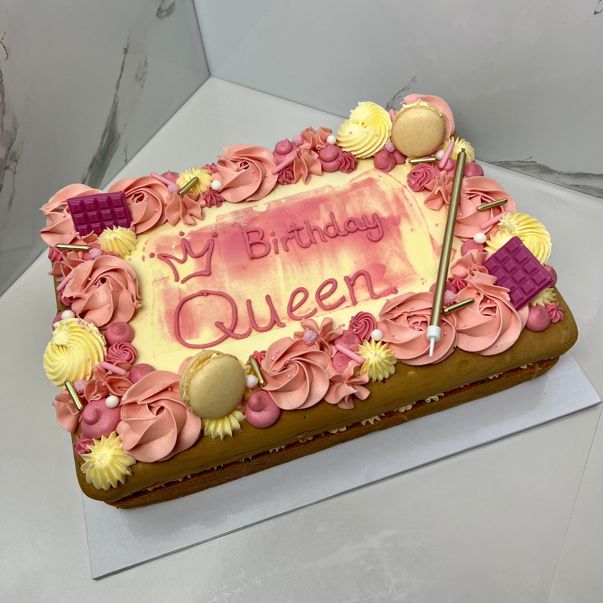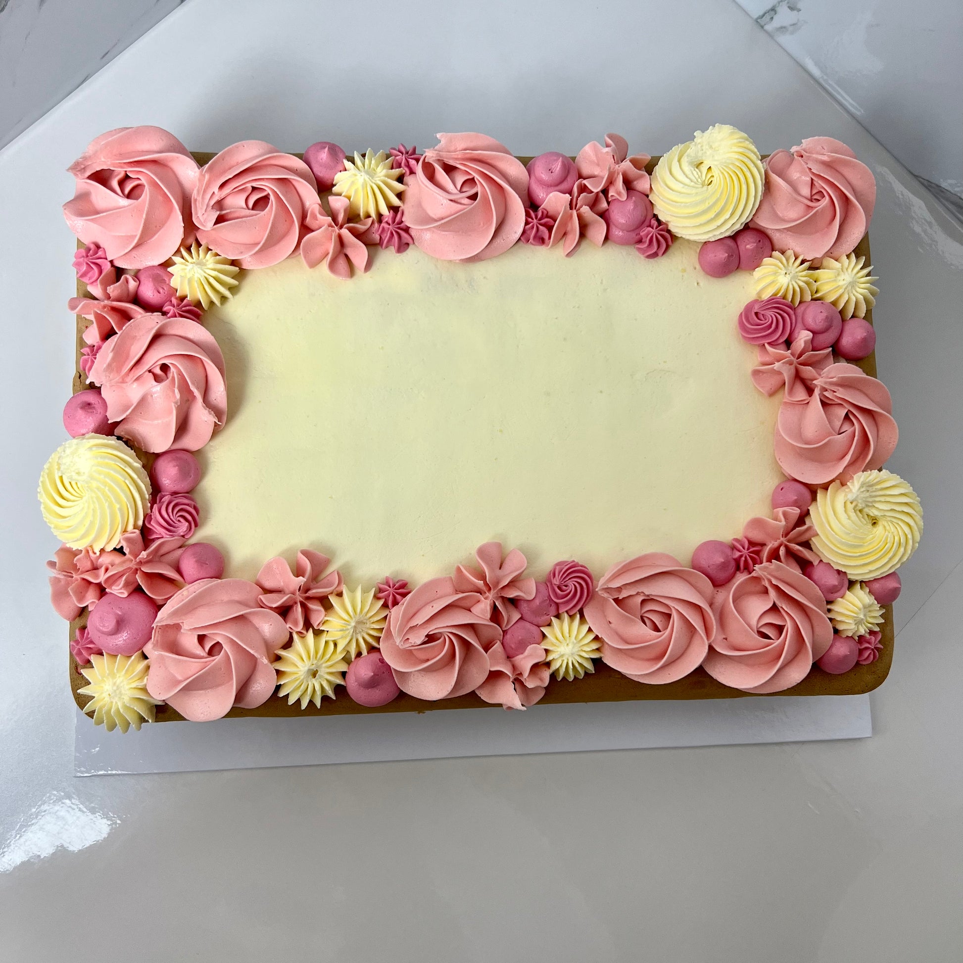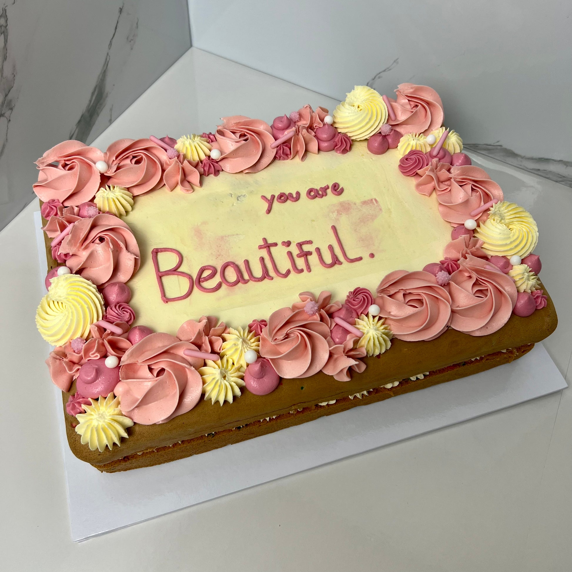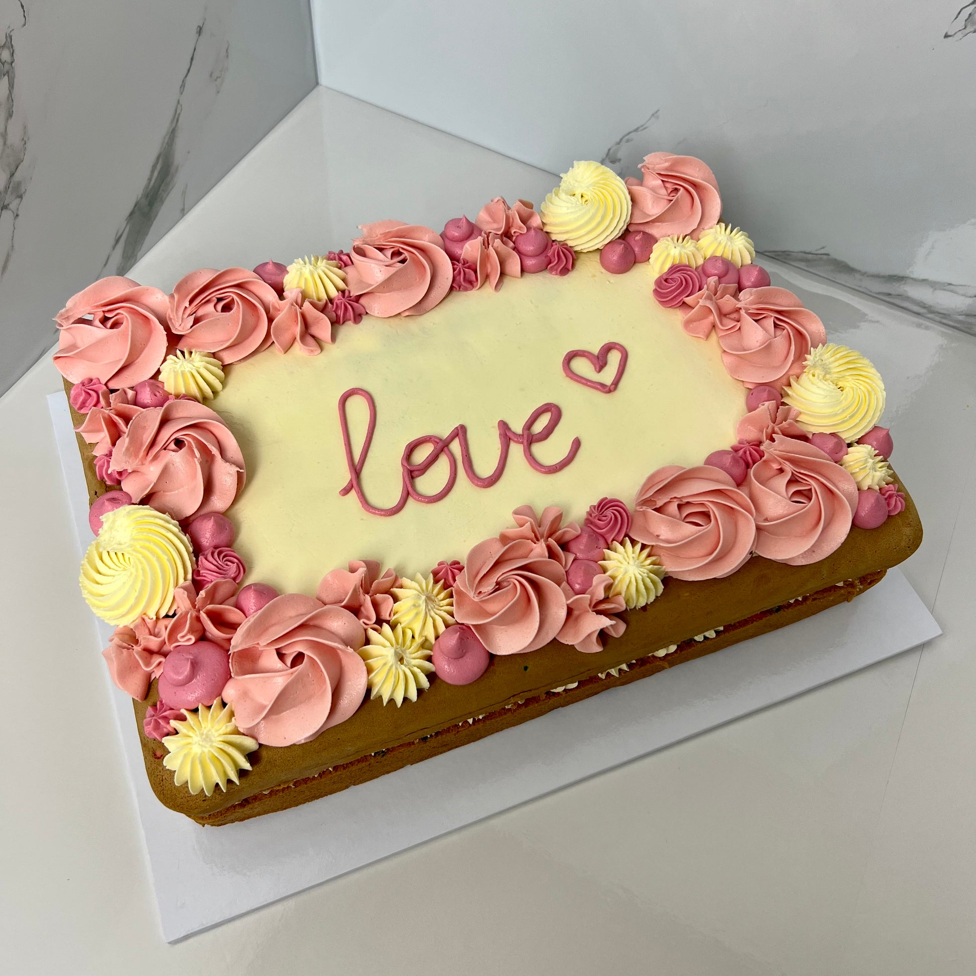 Met dit klassiek, rechthoekig dessert zet je telkens weer iets fantastisch op tafel. Het unieke aan dit gebak is dat je een zelfbedachte boodschap kan laten schrijven boven op de taart, volledig eetbaar dus. Of nu iemand jarig is, je van iemand houdt of je een ander simpelweg wil laten weten hoeveel hij of zij voor je betekent, het kan allemaal!